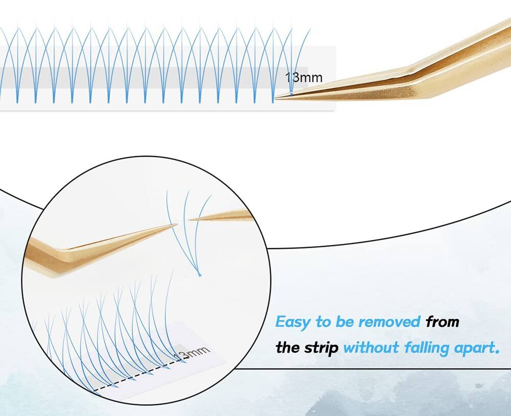 3.Middle Part Premade Fans Are Easier To Pick Up: The middle part of the premade fans eyelash extensions instead of the bottom was taped to the strip, the premade lash fans can be picked up more easily from the base, which helps you avoid falling apart caused by improper operation during lash extensions application.